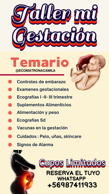 Con la grabación de este taller, tendrás toda la información que necesitas para llevar tu embarazo de manera óptima. Desde los controles y exámenes adecuados, hasta recomendaciones sobre ecografías, suplementos, cuidados de la piel y valiosos tips para cada etapa de tu gestación.